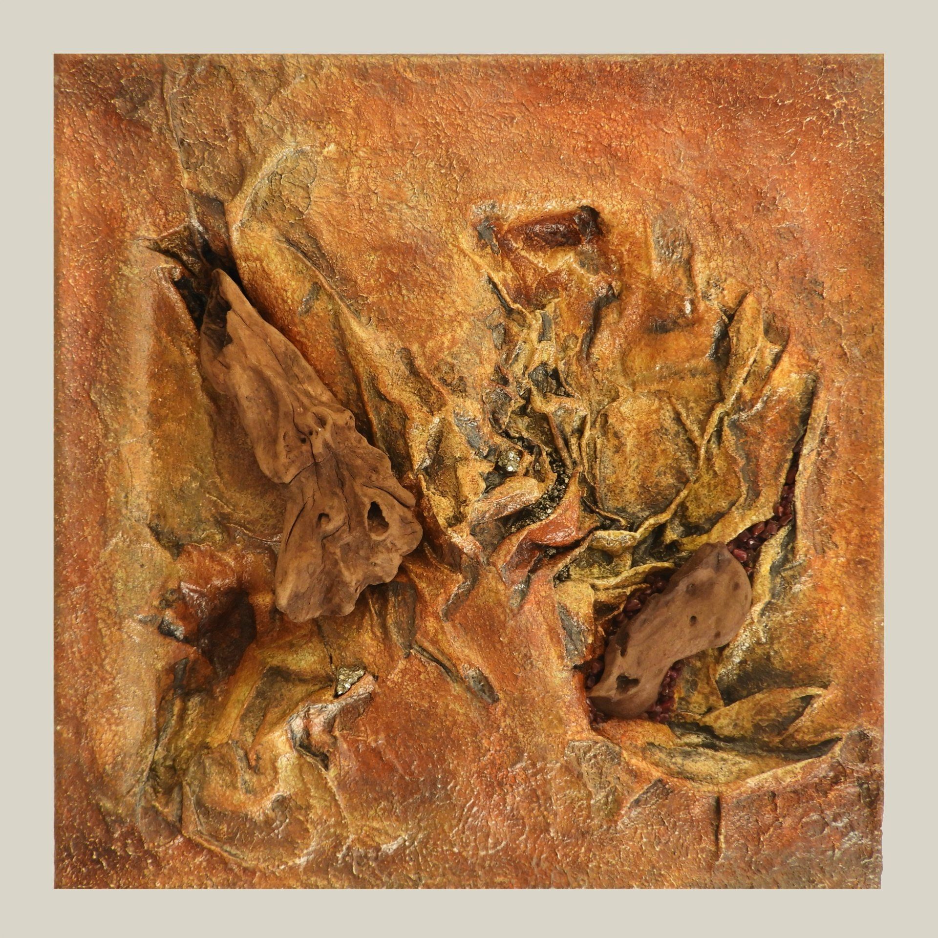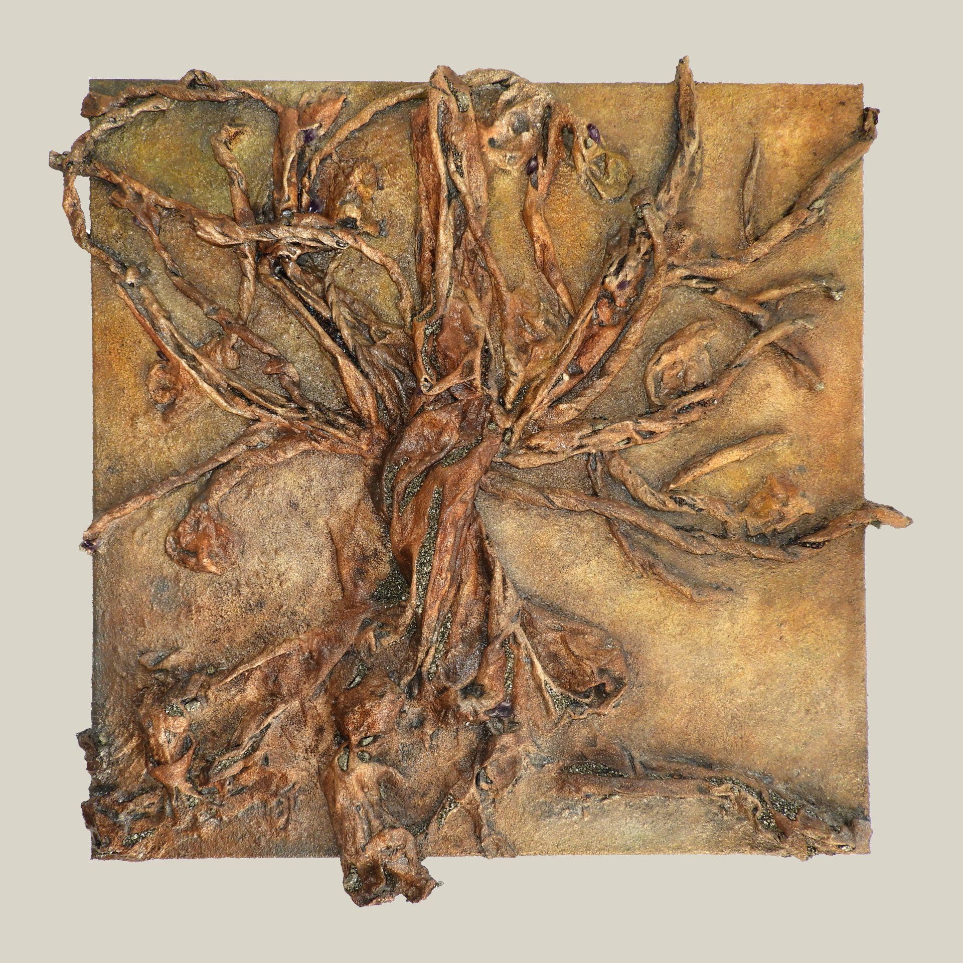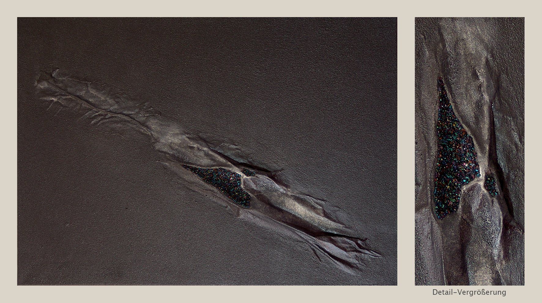 Collage mit Applikationen aus Bernstein, schwarzem Turmalin und Pyrit.