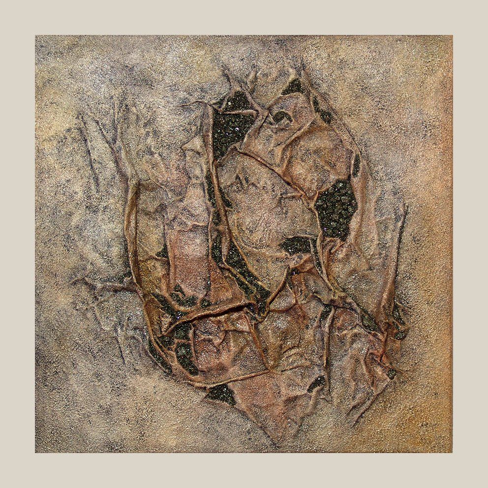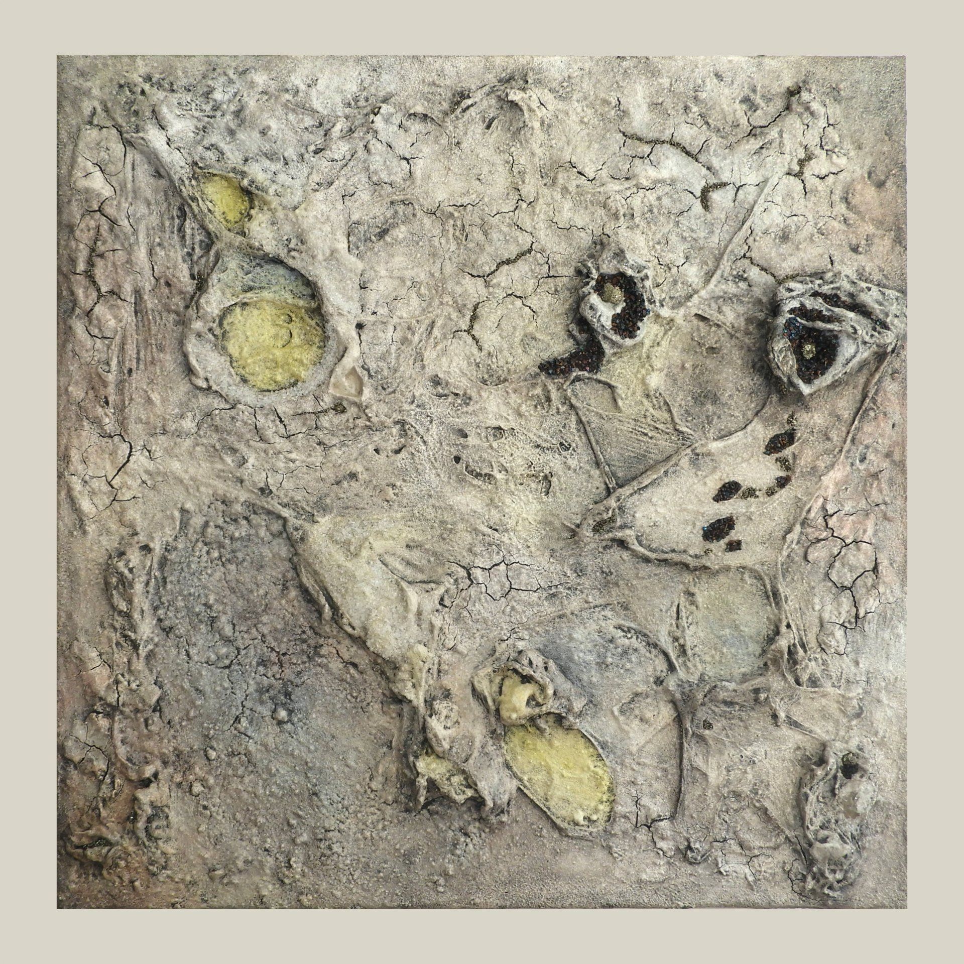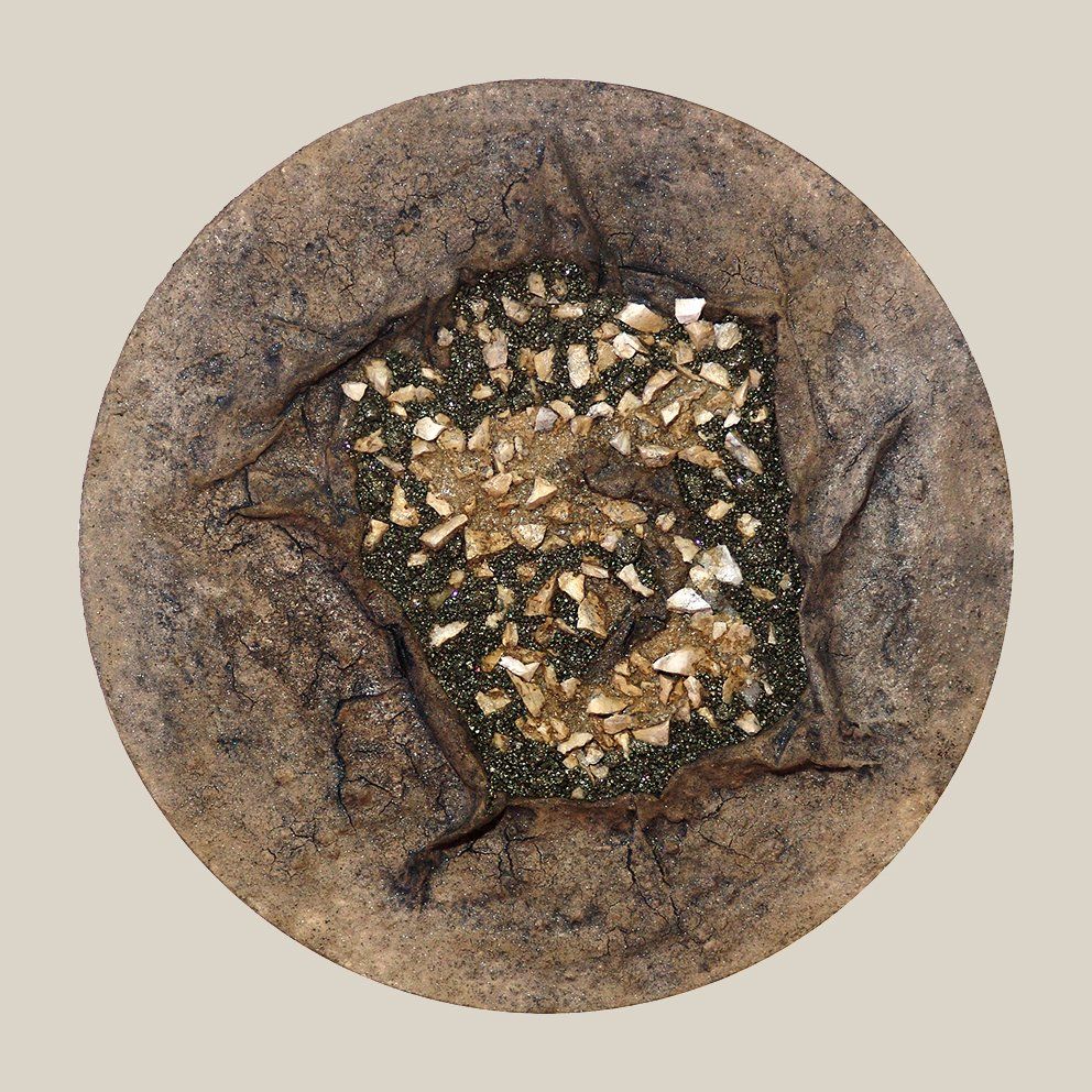 Collage mit Applikationen aus Bernstein, schwarzem Turmalin und Pyrit.