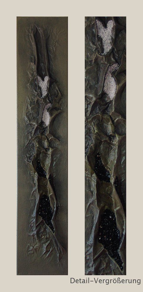 Collage mit Applikationen aus Bergkristall und schwarzem Turmalin.