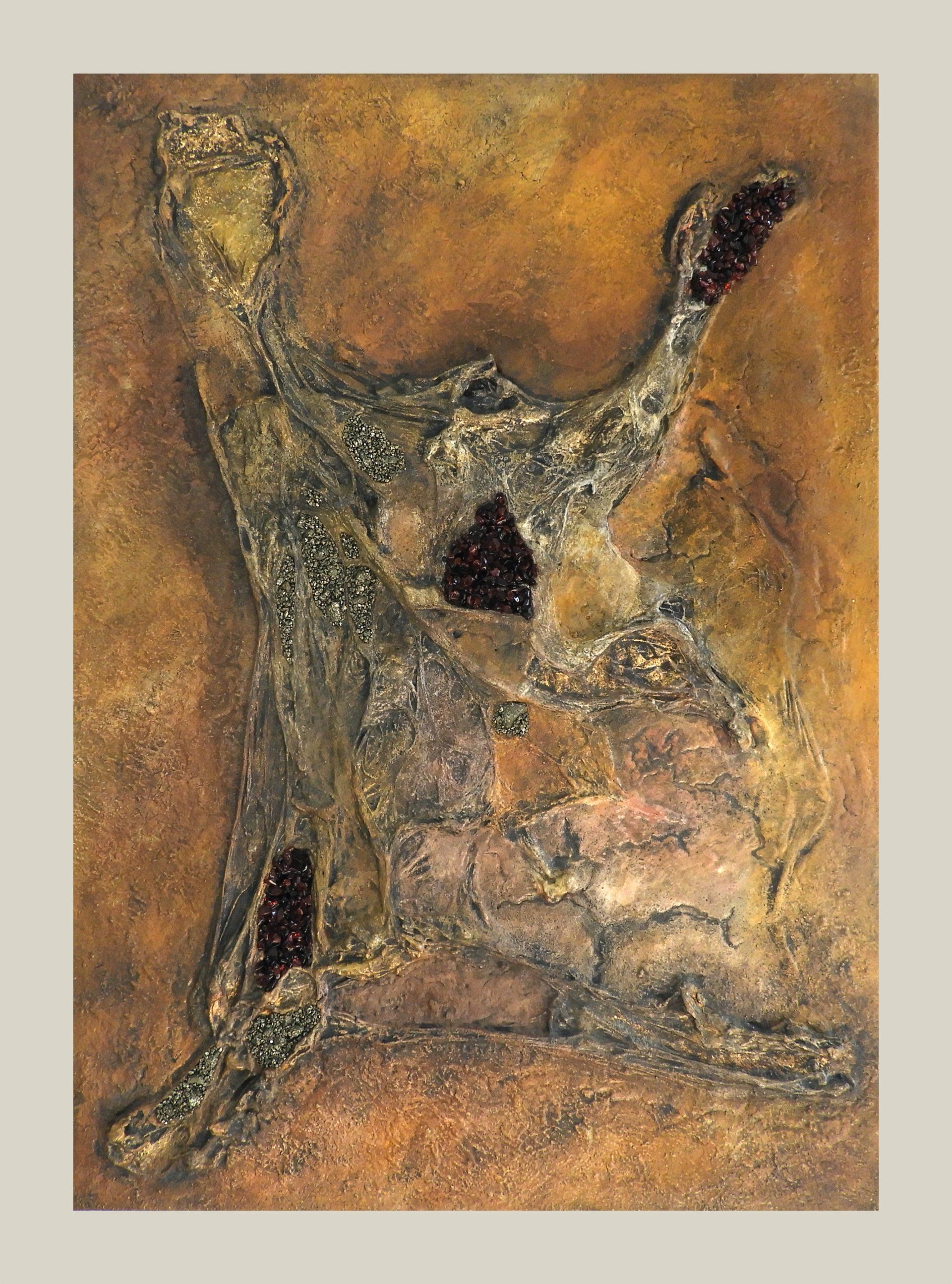 Collage mit Applikationen aus Granat undPyrit.