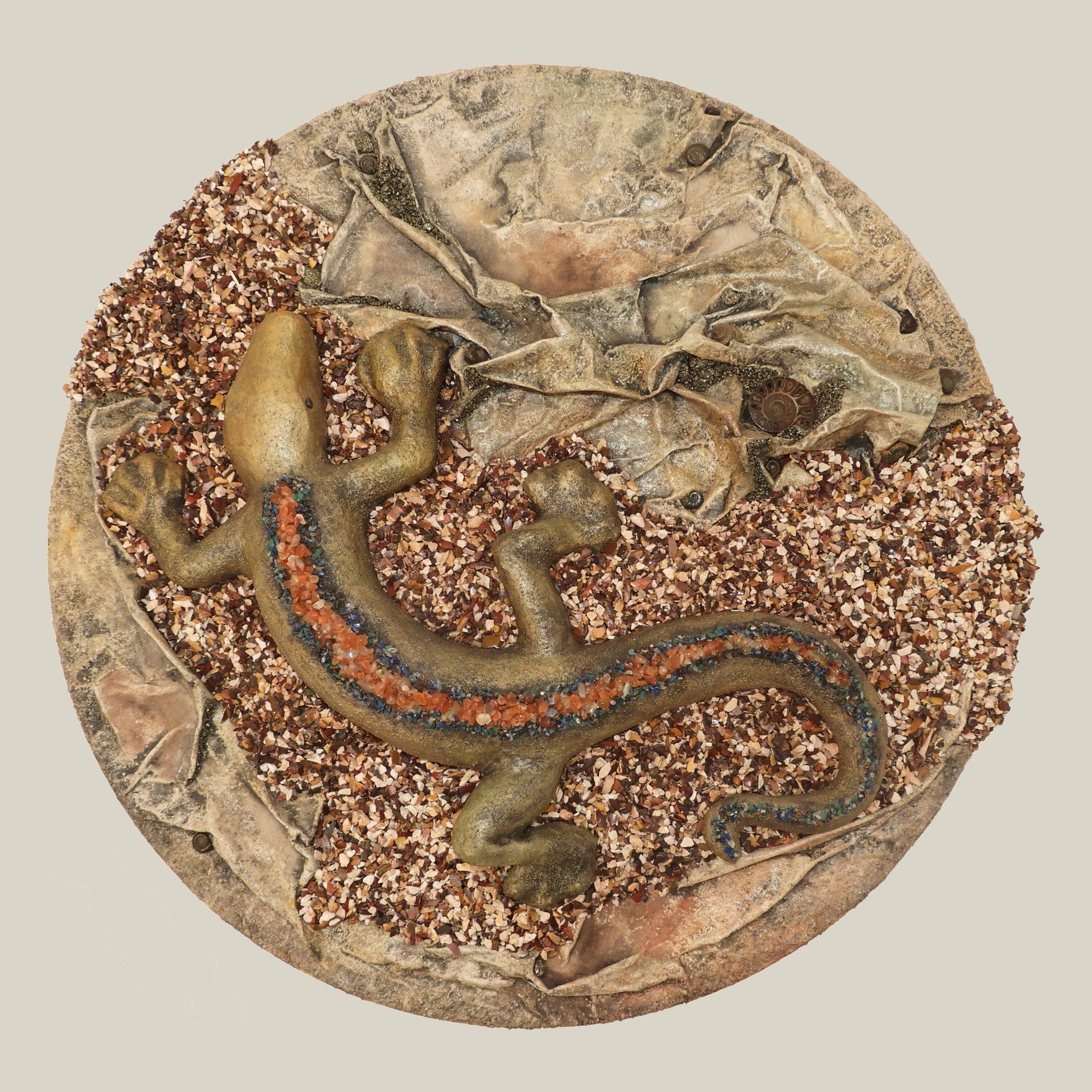 Collage mit Applikationen aus Pyrit, Apatit, Amazonit, Lapislazuli, Buntkupferkies (Bornit), Karneol, Hämatit (Blutstein), Mookait und Ammoniten.
